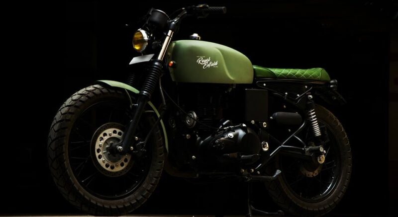 Just like every other custom bike, Cafe racer is not only a matter of taste. It is an atavistic mentality, a peculiar mix of dominant style, high speed and pretentious commitment to the Cafe Life and all its adventurous amusement. A right Cafe racer could be the egotistic charming uncompromising appearance of the owner on road. The … Continue reading Military Green Cafe Racer over a Royal Enfield Classic ~ Eimor Customs