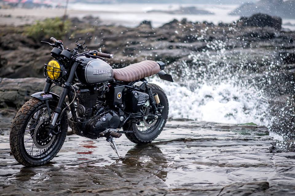 The bike entitled as Reckless, and here we have details from the builder himself, “Built for our Head Designer, this is Reckless and is a personal expression of his style. This top end Scrambler is based on a Classic 500 which started of with a power mod and an engine upgrade to 540 CC , with revised sprocketing, custom free-flow Stainless steel TIG welded exhaust and K&N filter with some exclusive power tuning on that vm 36 carb makes this machine the wildest we’ve built yet. It so so…so easy to loose that rear end in a drift ! Use front end with an on/off-road set of Ralco tyres , 120/18 front and a 140mm rear . Powder coated rims and engine , with a brushed steel paint finish on the tank , tanned leather bench seat and our personal favorite is the American Rugby Helmet style head light grill . It also has a Daymaker Headlight with a yellow tint and a twin pod speed/rpm unit . This was ridden to Goa for the Royal Enfield Rider Mania 2017 minutes after it was completed and an awesome ride it was, especially the crazy off road bits and drifting on the beach, we hope this ushers in a new breed of Custom motorcycle in India ………. Built for the the brave & Reckless !!”