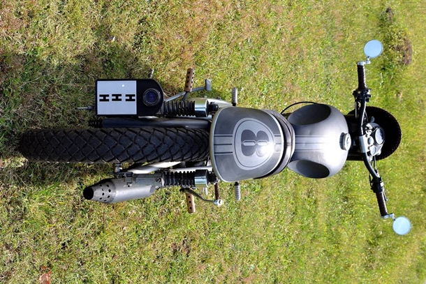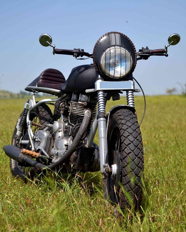 To give it a proper Cafe Racer look, the project started first by taking away as much parts as possible, so I literally stripped off the bike to bare engine and Chassis. Hand fabricated most of the parts myself using steel tubes and metal sheets (Cafe hump, headlight mask, silencer tip, front mudguard). The Fuel tank is standard company tank with knee dents created to match Cafe Racer theme. To add on to the aesthetics used Leather handle grips and leather seat, made the foot rest out of bamboo, used a Pentax Camera lens as a tail lamp to reflect my passion for photography.