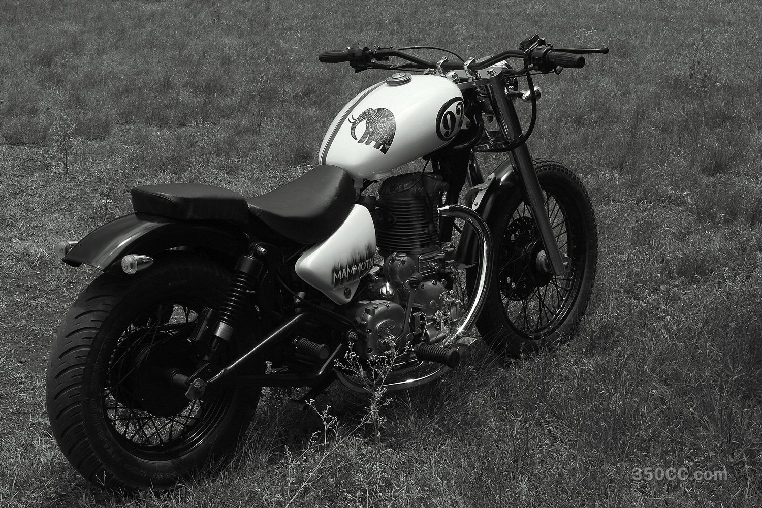 The turn signals have a built in tail light, The fenders, seats, Front fork(T & Covers) and swing-arm are all in house custom work, and all black has been powder coated on! The paint was done by hand Inhouse by Pia Van Heijningen, The Mammoth on the tank was done with a toothpick and took 4 nights to get the details in! The frame has been completely un-touched so it can be brought back to its original form over night! this was an overall Low budget custom and the total investment for the build was Rs 55,000/-