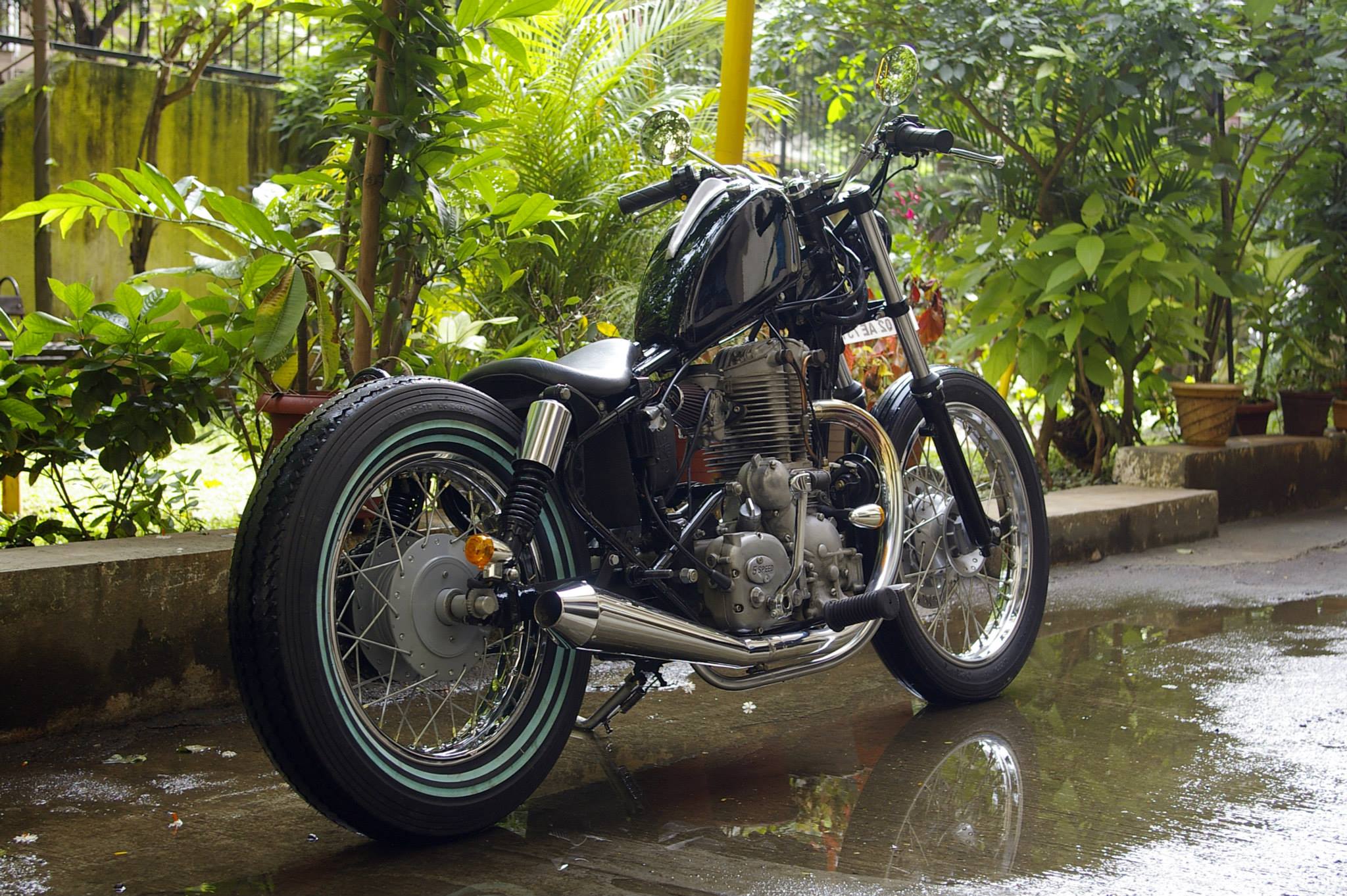 There are no changes or alterations to the stock chassis or forks keeping functionality in mind. It does have an extended swing-arm to sit low.