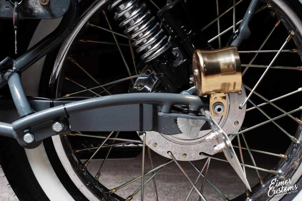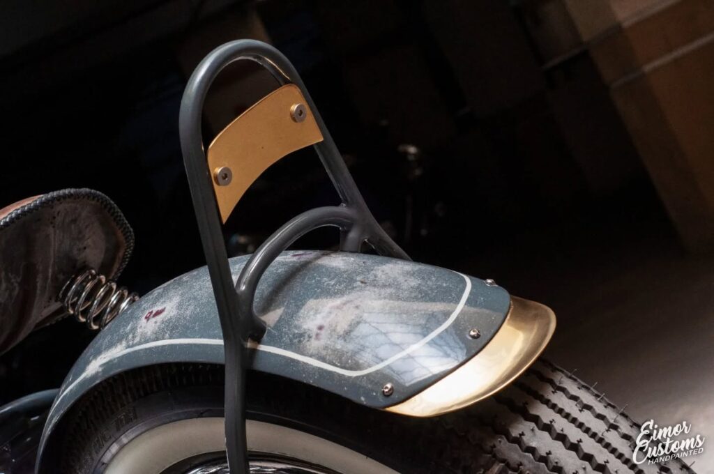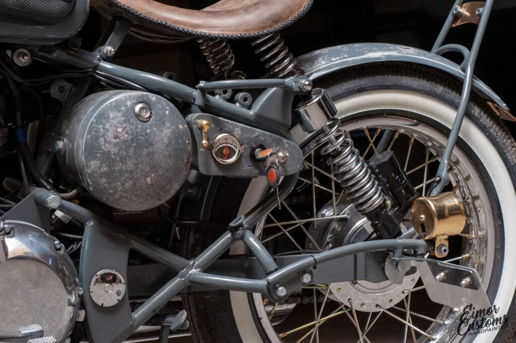 Visually, the stance leans unmistakably vintage. A springer front end anchors the bike and immediately recalls another era. At the same time, it reinforces the mechanical honesty of the build. Distressed body panels flow seamlessly into classic whitewall tyres. As a result, the motorcycle sits with timeless, balanced proportions. At the centre, a beautifully aged leather solo seat completes the picture, already worn-in and inviting.
