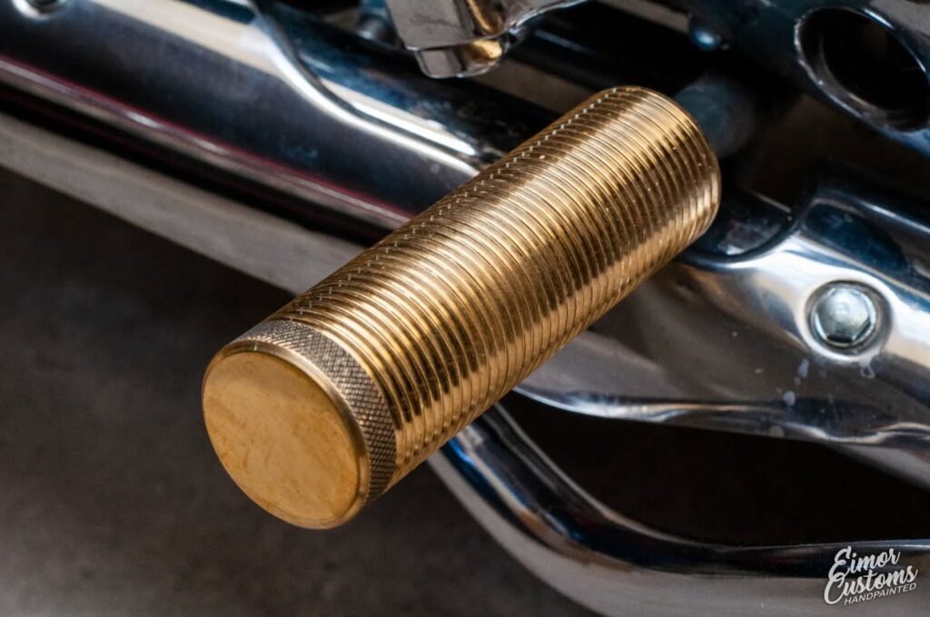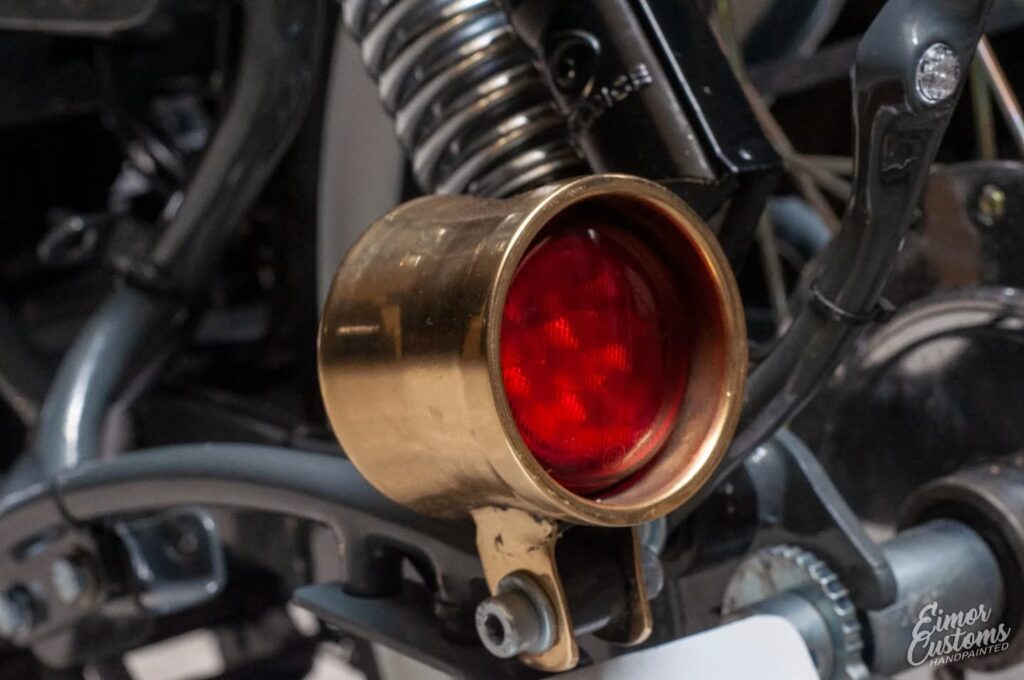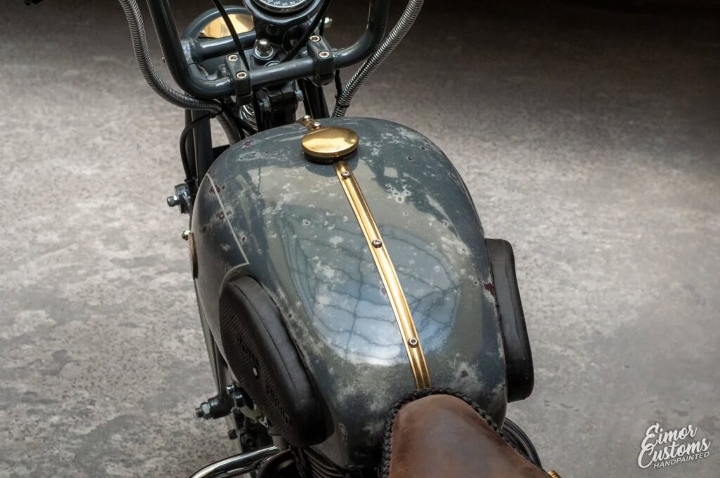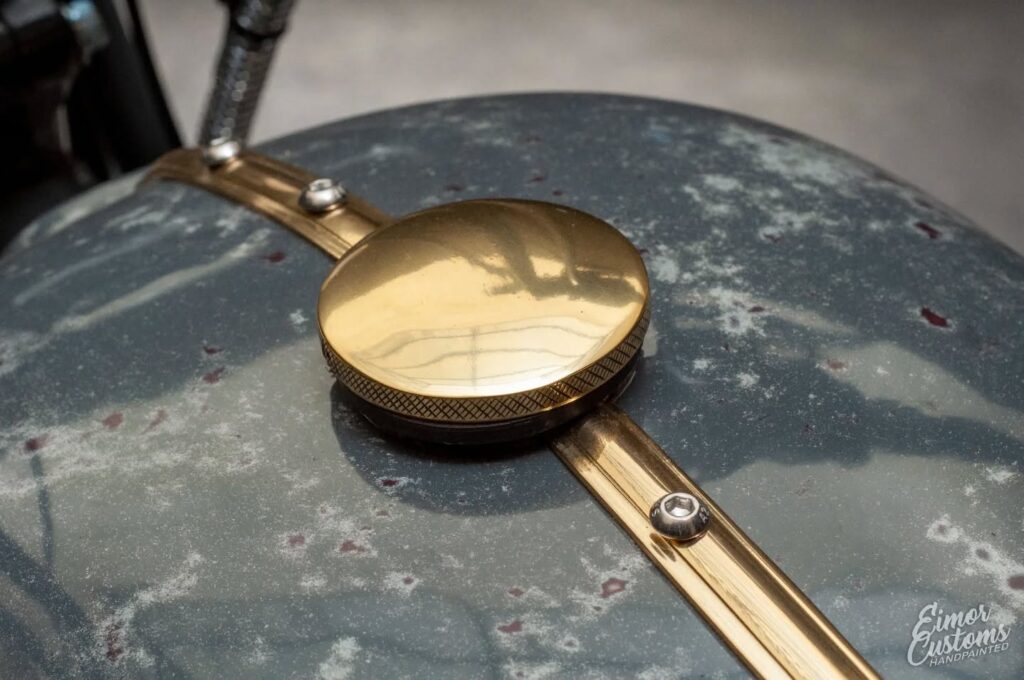 Looking closer, the craftsmanship begins to reveal itself. Custom brass details appear throughout the motorcycle, adding warmth against the muted paintwork. Specifically, the tank strap, fuel cap, levers, footpegs, and trim pieces feel purposeful and period-correct. Over time, these elements will age naturally. In doing so, they will evolve alongside the motorcycle itself.
