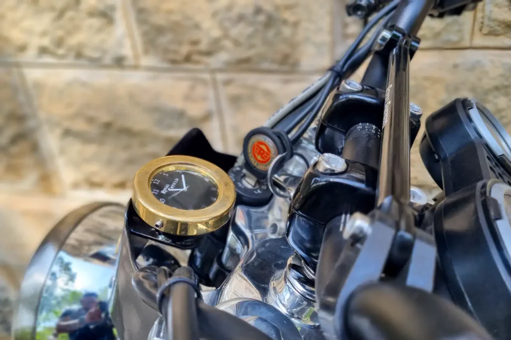 Above the headlight sits a hand-cut brass badge, which quickly becomes a focal point. A brass-bezel timepiece adds another subtle yet elegant accent. These brass elements bring warmth and craftsmanship into the design.