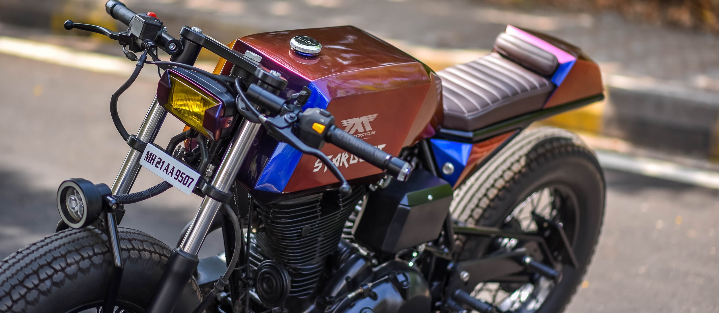 Stardust is a futuristic cafe racer built by Maratha Motorcycles. The custom bike uses a Royal Enfield Classic 350 as its base. Overall, the build blends modern design with classic cafe racer roots.